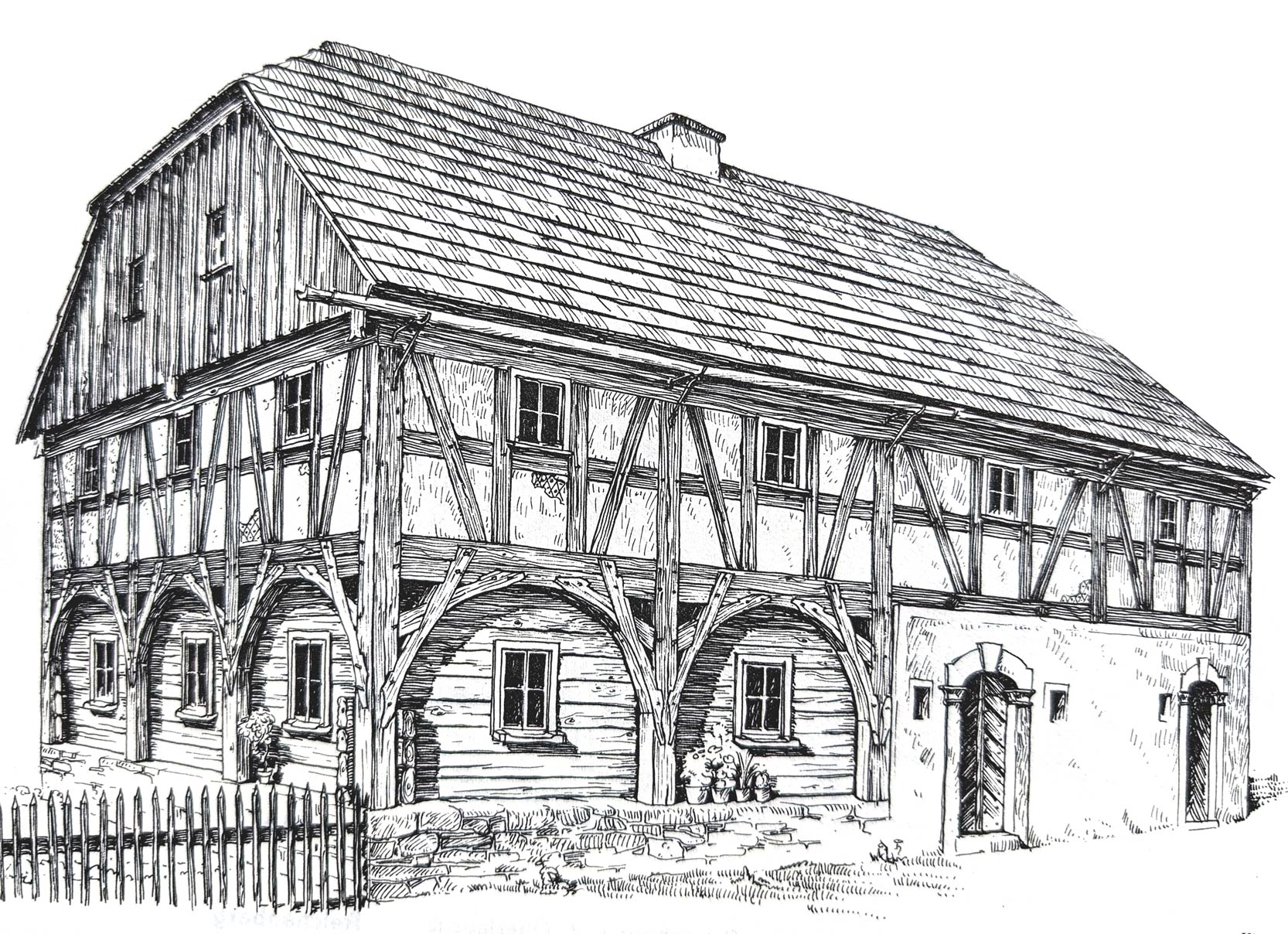 Ale kombinacje mogły być różne – zdarzają się budynki o konstrukcji zrębowo-ryglowej, a także zrębowo-zrębowej. W niektórych dach spoczywa bezpośrednio na przysłupach.
