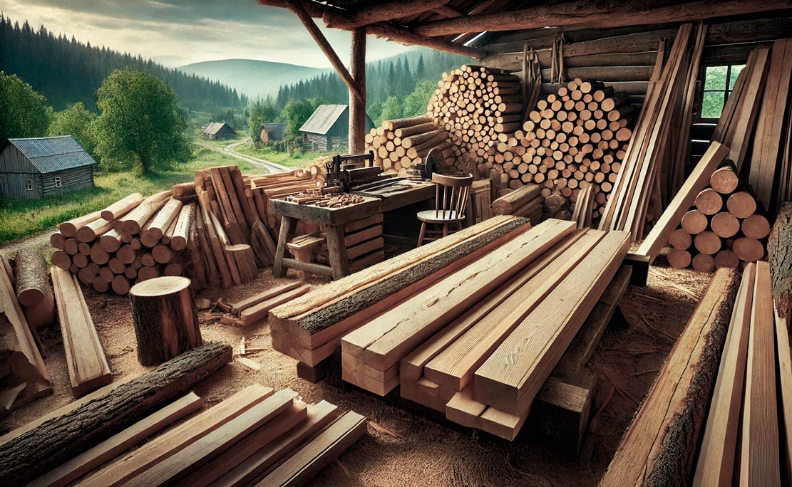 Stosujemy pozyskane lokalnie drewno surowe do budowy konstrukcji.